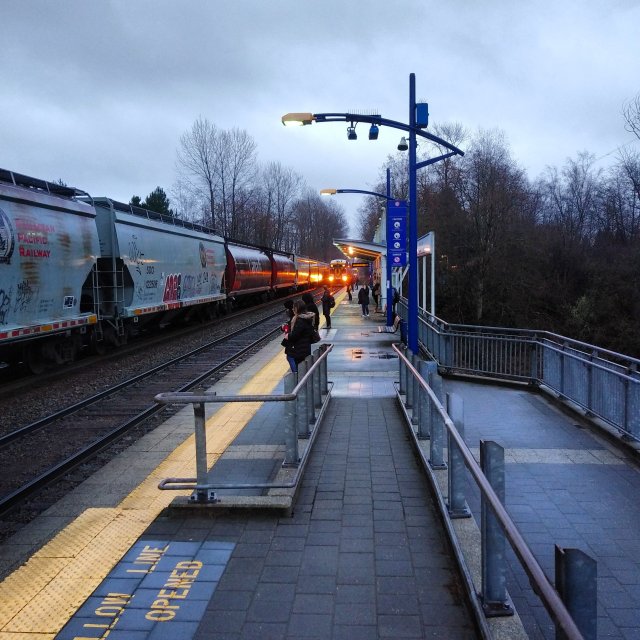 Four people on a bus that’s normally full. The bus terminal is deserted. None of this is helped by the return of the usual late March Lower Mainland rain and gloom after a week of sun and its attendant hopefulness. Two people have passed through the entry gate to the train in the ten minutes I’ve been standing here. Oh, wait…. there’s a third.